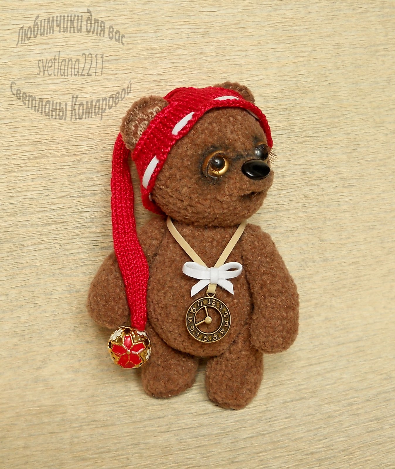 Малыш связан из велюровых ниток, оформлен в новогодней тематике
